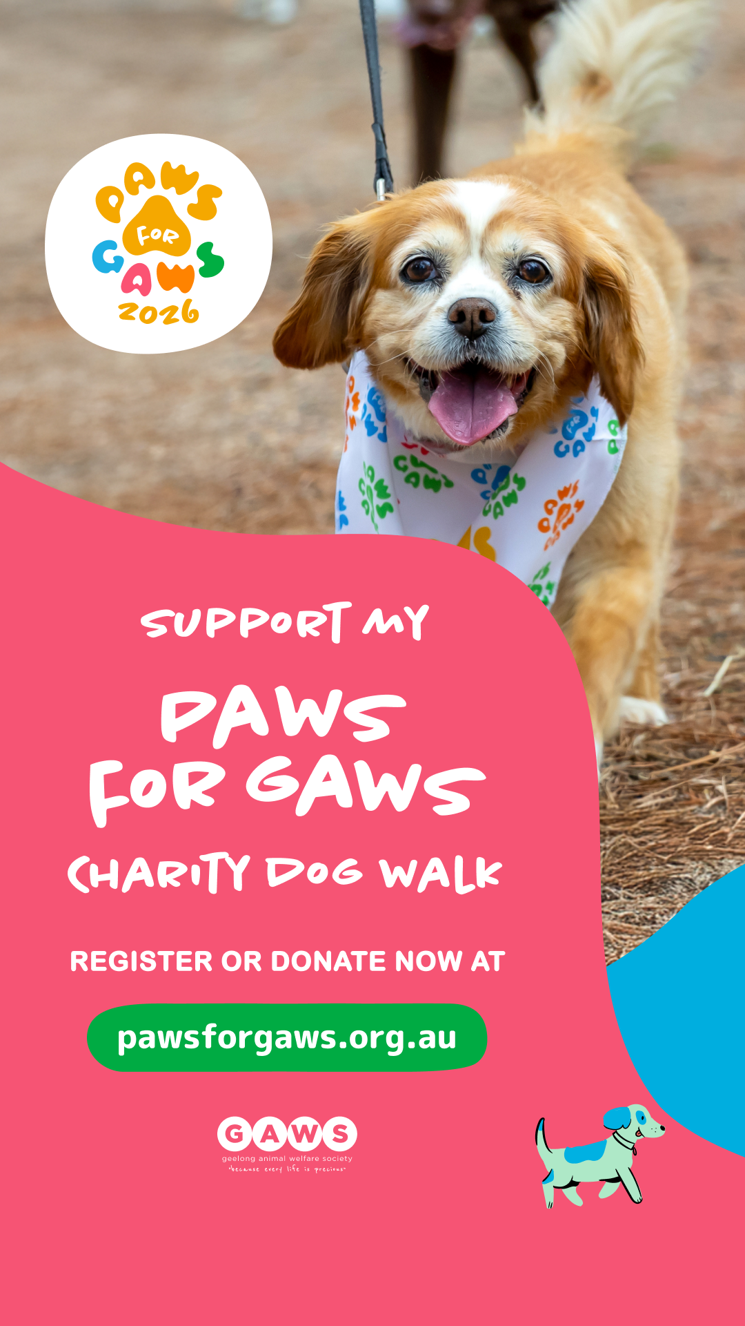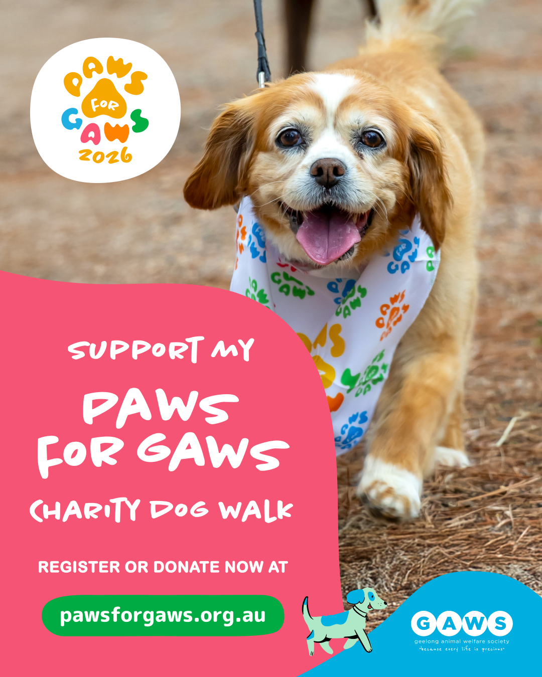 Promote your fundraiser using social media. Use a strong picture, direct language with instructions, and include the hash tags #PAWSforGAWS2026 #GAWS #geelonganimalwelfaresociety #charitydogwalk #fundraiser